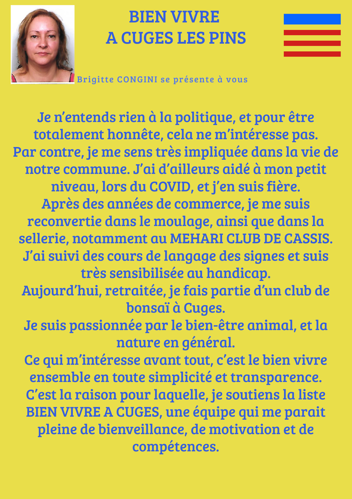 Très sensible au bien vivre-ensemble et bien ancrée dans la vie de notre commune, je rejoins la liste Bien Vivre à Cuges, une liste sans étiquette politique !