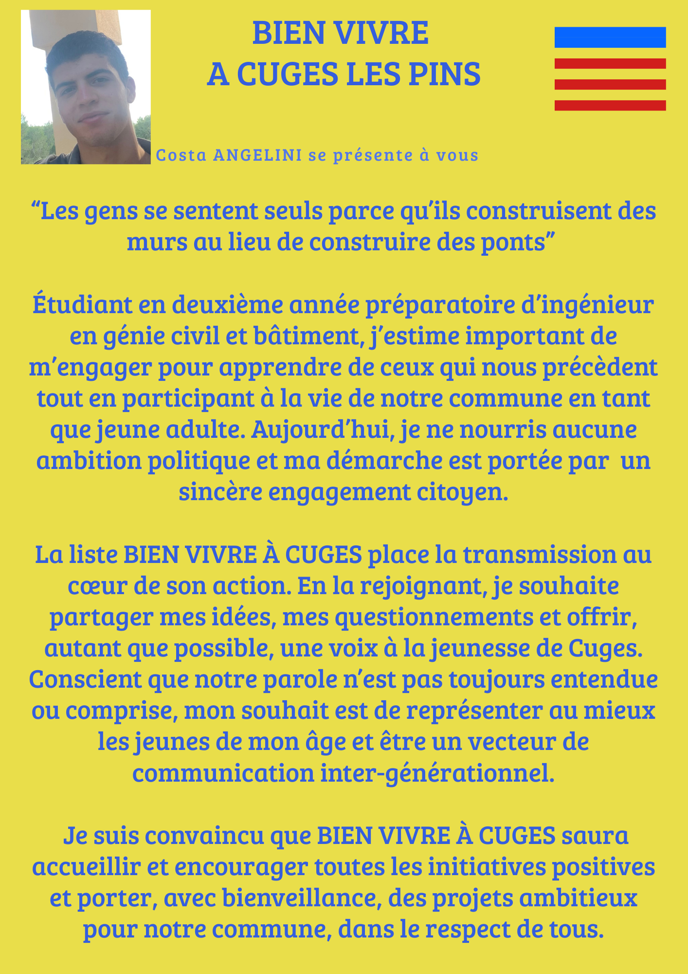 Déterminé à améliorer, renforcer et protéger notre cadre de vie, je mettrai toutes mes compétences techniques au service de notre commune. Je m’engage sur la liste Bien Vivre à Cuges pour que les choses changent !