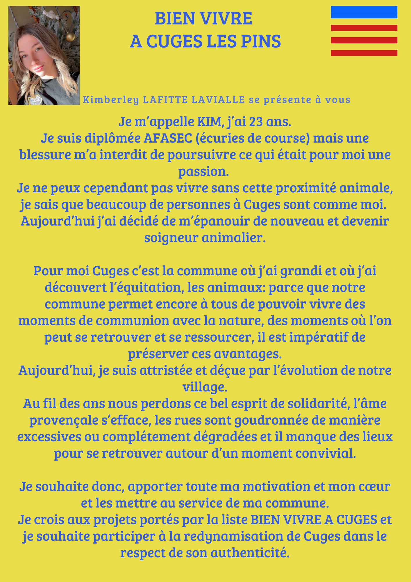 Déjà impliquée dans les travaux menés par l’association des Agriculteurs de Cuges-les-Pins, je souhaite m’investir davantage et mettre mes expériences professionnelles au service de projets réfléchis, réalistes et cohérents.