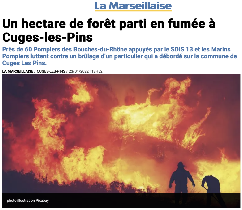 Il s’agit de prévenir la population, car les pompiers sont déjà engagés sur l’incendie et dispersés avec ceux des communes voisines sur le front de l’incendie et sont en transit vers Cuges par la route nationale depuis Gemenos ; ceux-ci ne pourront pas intervenir dans le déluge de feu qui va s’abattre sur la Commune..